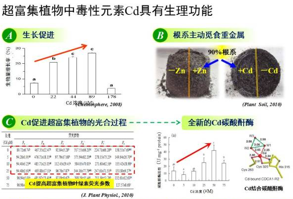 在“超富集植物中毒性元素Cd的生理功能研究”中,课题组发现:Cd在海洋硅藻中发挥生物学功能,替代补偿了光合Zn酶碳酸酐酶(CA)中的Zn。Cd可以替代补偿其它多种Zn酶(藻类、微生物、动植物)中Zn的功能。“毒性元素”Cd在超富集植物中具有生理功能,主要通过促进光合作用的关键酶碳酸酐酶的金属活性位点促进植物生长。