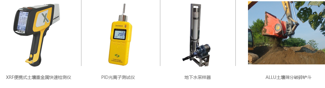 XRF便携式土壤重金属快速检测仪、PID光离子测试仪、地下水采样器、ALLU土壤筛分破碎铲斗等专业技术装备。