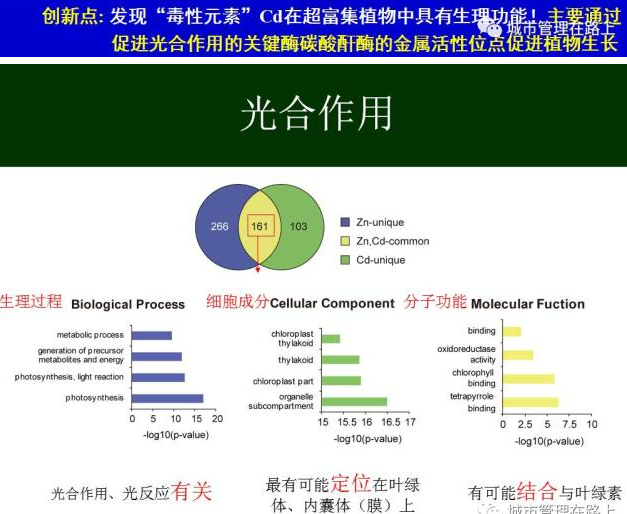 在“超富集植物中毒性元素Cd的生理功能研究”中,课题组发现:Cd在海洋硅藻中发挥生物学功能,替代补偿了光合Zn酶碳酸酐酶(CA)中的Zn。Cd可以替代补偿其它多种Zn酶(藻类、微生物、动植物)中Zn的功能。“毒性元素”Cd在超富集植物中具有生理功能,主要通过促进光合作用的关键酶碳酸酐酶的金属活性位点促进植物生长。