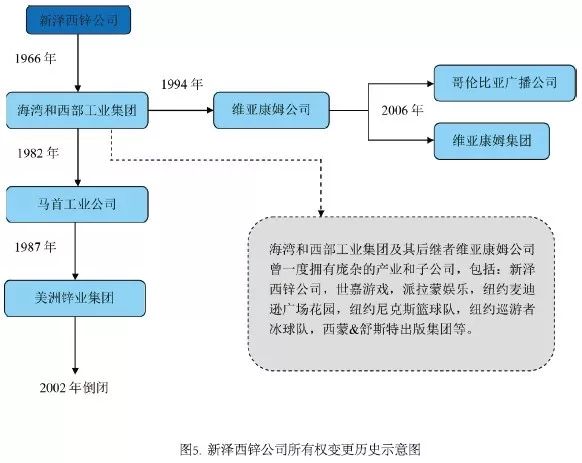 首先遇到的难题是污染责任人的追溯。新泽西锌公司早在1967年就将帕尔默顿的工厂出售给了海湾和西部工业集团。其后几经辗转(图5),绝大部分污染责任最终定为让哥伦比亚广播公司、TCI太平洋通讯公司等5家公司承担。除上述主要涉事公司外,还有超过200家中小型公司不同程度地卷入了该工厂的生产和运营。复杂的公司结构和股权变更历史,让污染责任的追溯耗时费力,对初创的超级基金项目更颇具挑战性。