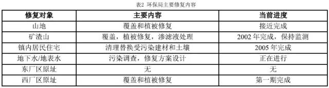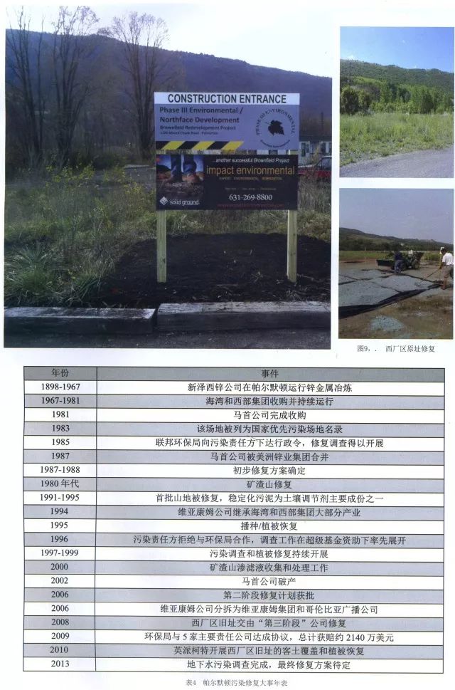 面对前景不明的污染责任诉讼、错综复杂的负面舆情和刻不容缓的环境风险缓释需求,联邦环保局于1991年起首先通过超级基金项目垫付费用,使修复得以启动(表2)。在项目初期,面对有限的预算,环保局广泛采用一种由稳定化污泥、粉煤灰和生石灰组成的人造土壤调节剂覆盖失去植被的山坡和矿渣山区域。其后,由于当地居民的反对,环保局又使用堆肥替代污泥。在每一片区域阶段性完工后,又将适宜当地气候的植物种子和肥料通过卡车和飞机被抛洒到地表。迄今,植被得到了初步恢复,据估计,已有近30万吨土壤调节剂被用于该部分修复,耗资逾千万美元。