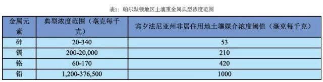然而,世上不存在永久的理想中的乌托邦。到20世纪中叶,帕尔默顿因多年的锌金属冶炼,造成了严重的土壤和地下水污染。新泽西锌业公司多年倾倒的累计超过三千万吨的矿渣堆积成了占地数百英亩、高达数十米的矿渣山,并因长年雨水冲刷产生了高污染的渗滤液,严重影响附近河流与地下水;此外,因工厂烟囱经年累月排出含有高浓度重金属的粉尘,全镇表层土壤和地下水均受到严重的重金属污染(表1),附近三千英亩山地也因此几乎寸草不生;而植被缺失造成的严重水土流失,又加剧了污染物在环境中的扩散和对附近居民健康的威胁。
