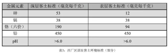 在此背景下,“第三阶段”公司为解决百万吨级“客土”的来源,于2010年找到纽约地区最大的土壤修复咨询公司和“客土”解决方案提供者之一——英派柯特(Impact)环境咨询公司寻求解决方案。英派柯特计划在未来10年为“第三阶段”公司获得满足相关标准(表3)的“客土”以满足修复需要,并向“第三阶段”公司支付每吨2-4美元不等的费用。“第三阶段”公司由此不但无须负担天文数字般的客土费用,还可从中获得足以支付绝大部分修复费用的现金流。迄今,英派柯特已提供近三十万吨“客土”,完成了西厂区原址第一阶段的覆土和植被恢复。