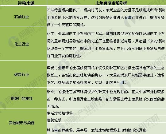 中国城市土地污染主要来源于石油行业,煤炭行业,钢铁行业,化工行业,还有制药、造纸、医药、纺织等轻工业行业,这些主要来源也构成了我国土壤修复的主要市场。