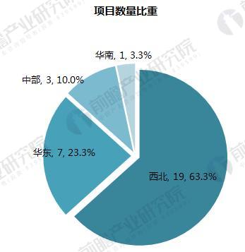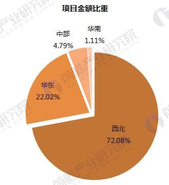 从项目投资总额所占比重来看,西北地区金额占比达到72%,高于其数量比重(63.3%);华东地区金额占比22%,低于其数量比重。
