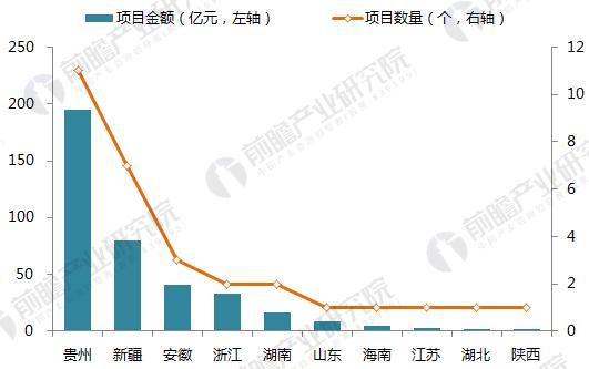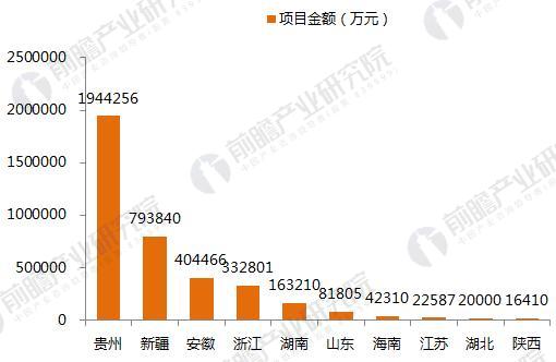 从金额上看,截至2018年3月投资总额最多的也是贵州、新疆、安徽,分别为194.43亿元、79.38亿元、40.45亿元。