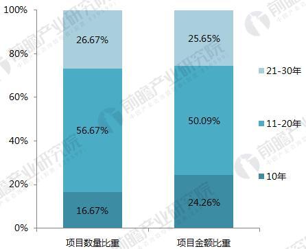 15年的项目数量最多,但10年的项目投资金额最高,截至2018年3月合同年限为15年的项目共10个,合同年限为10年的项目投资金额共92.71亿元。