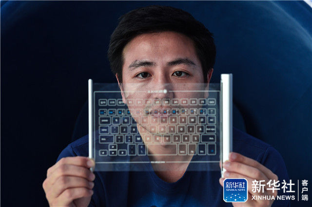 8月18日,柔宇科技创始人、董事长兼CEO刘自鸿在广东深圳柔宇科技总部展示应用了柔性传感技术的柔性键盘。新华社记者毛思倩摄