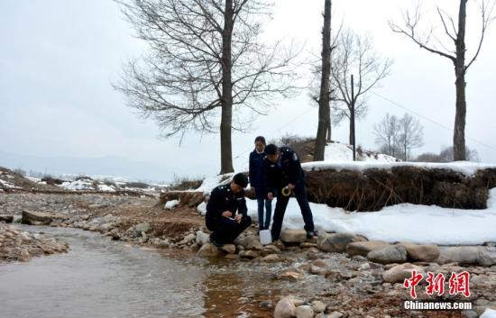 资料图:甘肃渭源县环保局执法人员在峡口水库水源地取样。王纲摄